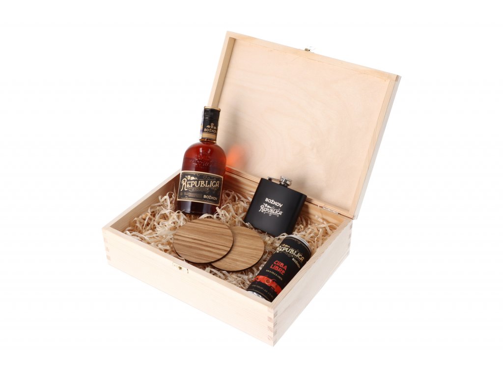 Dřevěná dárková krabička ukrývá v jedinečném balení na míru vysoce ceněný rum Republica. Potěší znalce kvalitního pití a také narozeninové oslavence, novomanžele, obchodní partnery i zaměstnance.