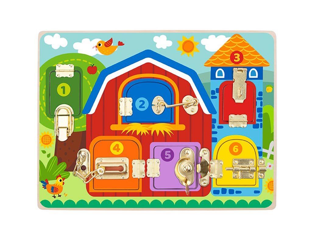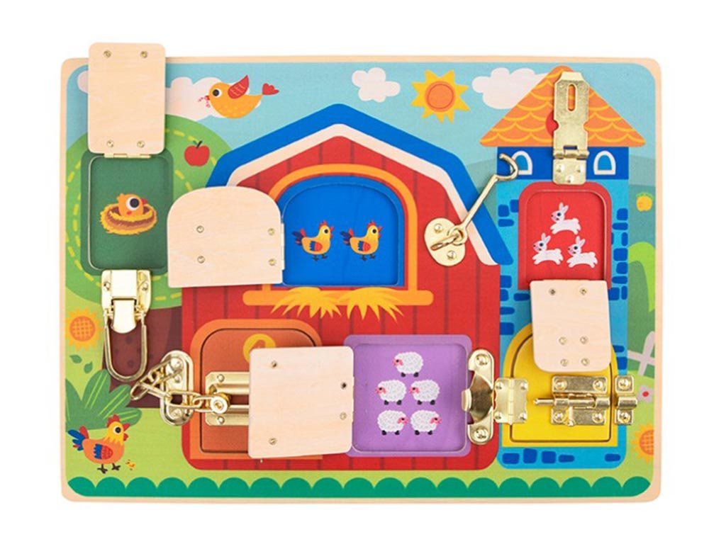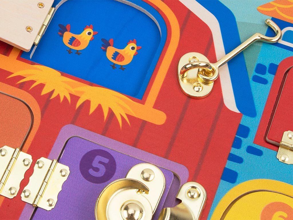 Na desce najdete různé typy zavírání - západky, háčky nebo zámky, které děti otevírají a zavírají. Při hře tak přirozeně rozvíjejí jemnou motoriku, koordinaci ruka-oko i logické uvažování. Farmářské motivy navíc podporují fantazii a vytváření vlastních příběhů ze života na venkově.