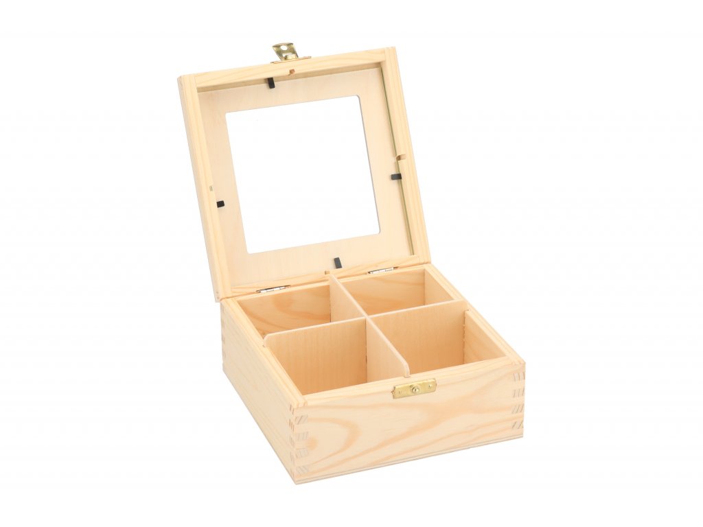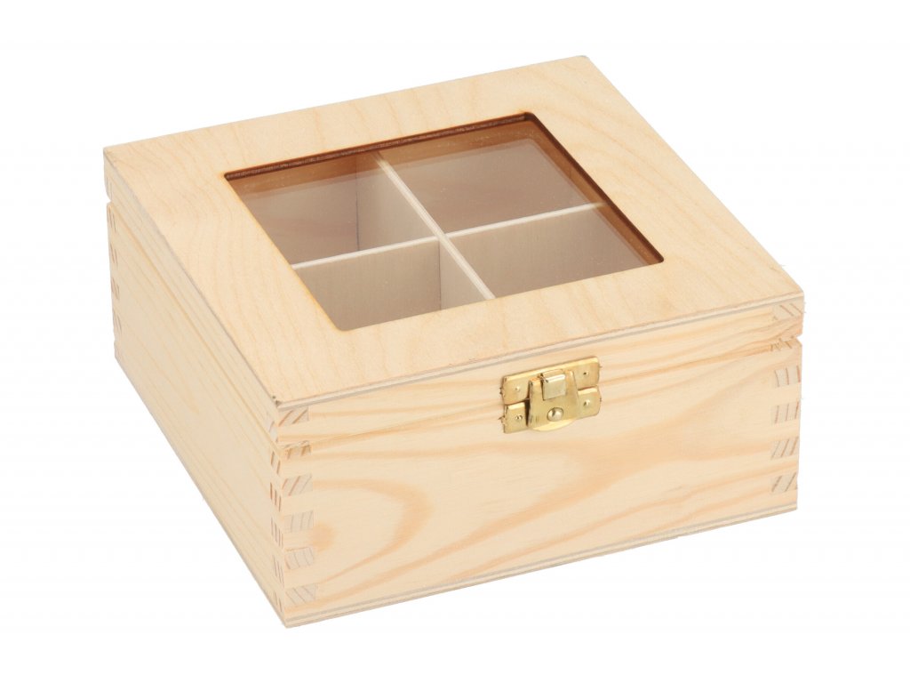 Krásná dřevěná krabička s bezpečným zavíráním, do které si uložíte všechny své oblíbené čaje. Můžete je v této podobě velmi elegantně a stylově nabízet také návštěvě. Vnitřek je rozdělen na 4 přihrádky, které oddělí různé druhy čajů. Díky průhlednému skleněnému víku budete mít nad obsahem stále přehled.