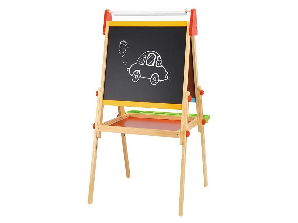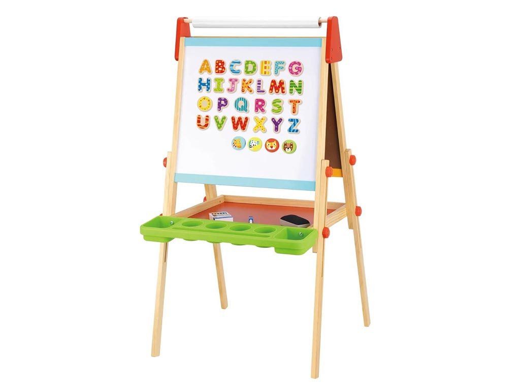Součástí je praktické příslušenství, jako jsou křídy, mazací houbička, magnetické doplňky nabo role papíru, které rozšiřují možnosti hry a učení. Děti si tak mohou kreslit, skládat obrázky nebo se seznamovat s písmeny a čísly.