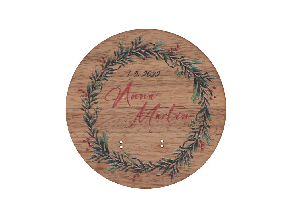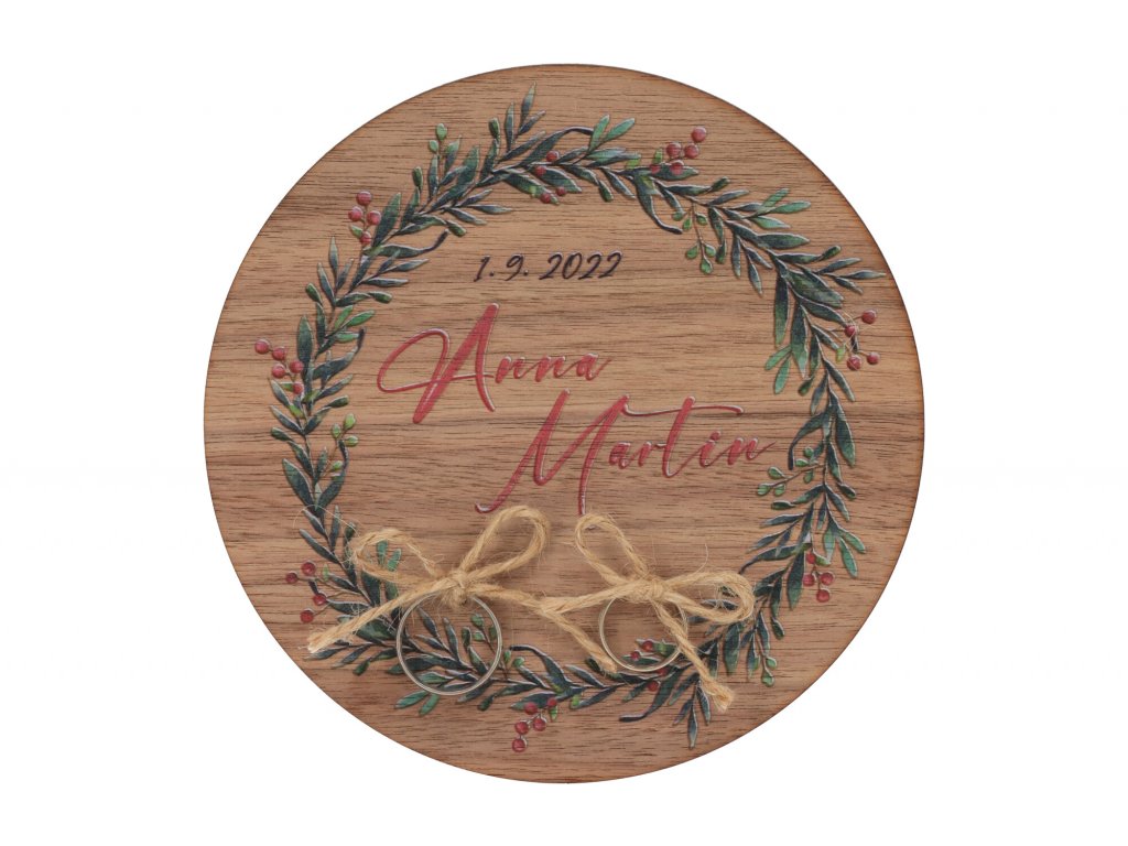 Dřevěná podložka na snubní prsteny ořech - cesmínový věnec