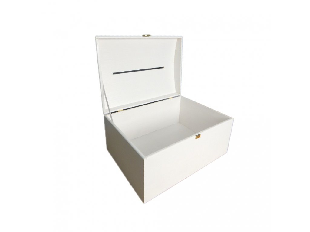 Skvěle se hodí třeba na svatební den. Truhla pojme spoustu obálek a svatebních přání, délka výřezu na horní straně je přibližně 18 cm.