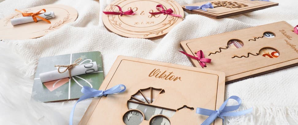 Kapsa na peníze ze dřeva v atraktivním designu je originální způsob, jak darovat peníze a neunudit obdarovaného k smrti. Každý si pak vybere dárek podle svého gusta, a vy tak dáte najevo, že jste si přece jen dali na dárku záležet. V této kategorii najdete originální obálky, dřevěné kapsy a dárkové karty na peníze k nejrůznějším příležitostem jako jsou narozeniny, Vánoce, promoce, svatba i rozlučka se svobodou.