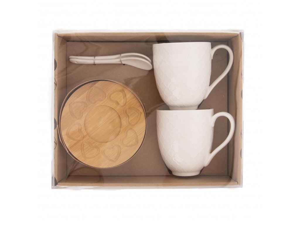 Dřevěný podtácek z bambusu s porcelánovým hrníčkem a lžičkou. Balení obsahuje 2 komplety ( podtácek, hrníček, lžička).