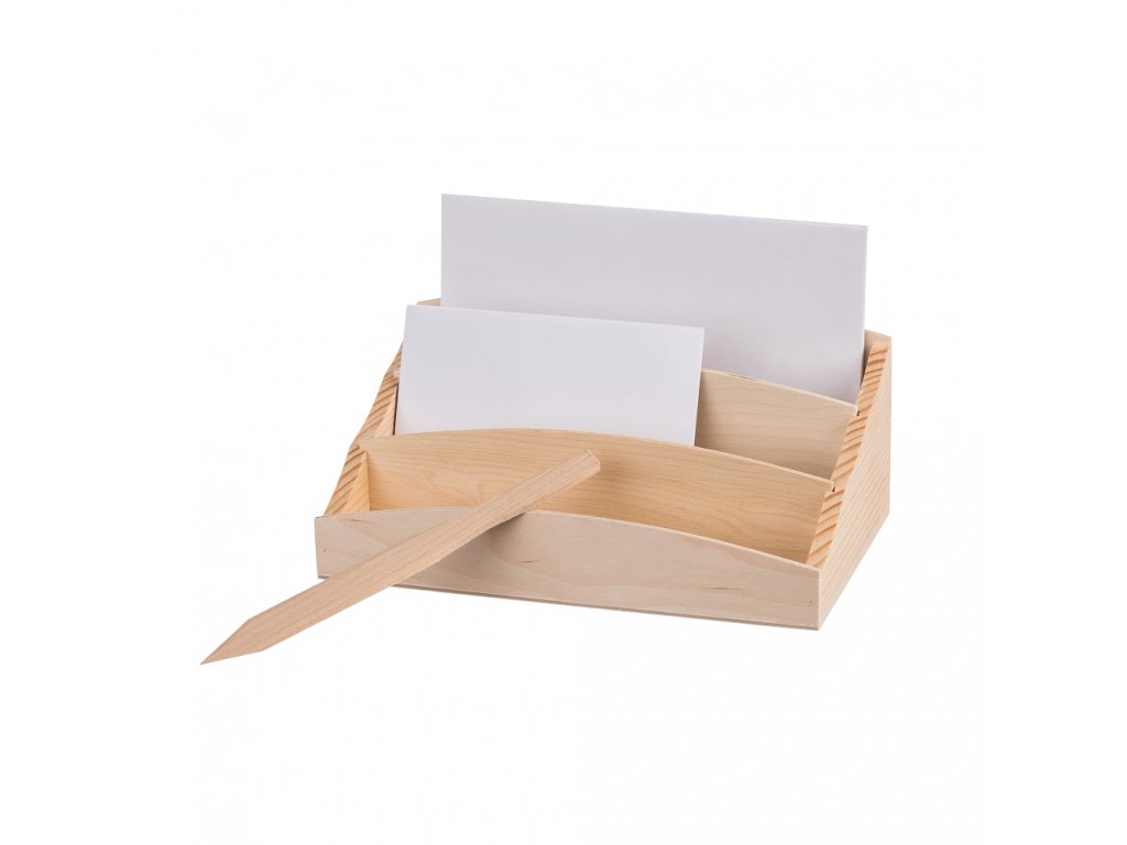 Organizér na dopisy disponuje třemi přihrádkami a dřevěným nožem na šetrné otevírání dopisů.