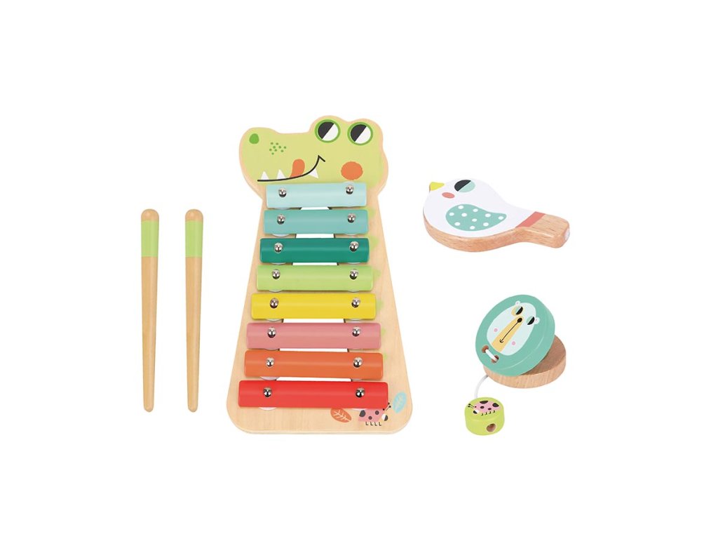 Dětský dřevěný xylofon je ideální první hudební nástroj pro malé budoucí hudebníky. Díky barevným kovovým plátkům, na které se hraje dřevěnou paličkou, se děti seznamují se světem tónů zábavnou formou. Hra na xylofon rozvíjí sluch, jemnou motoriku i koordinaci pohybů, a zároveň podporuje kreativitu a hudební cítění už od raného věku.