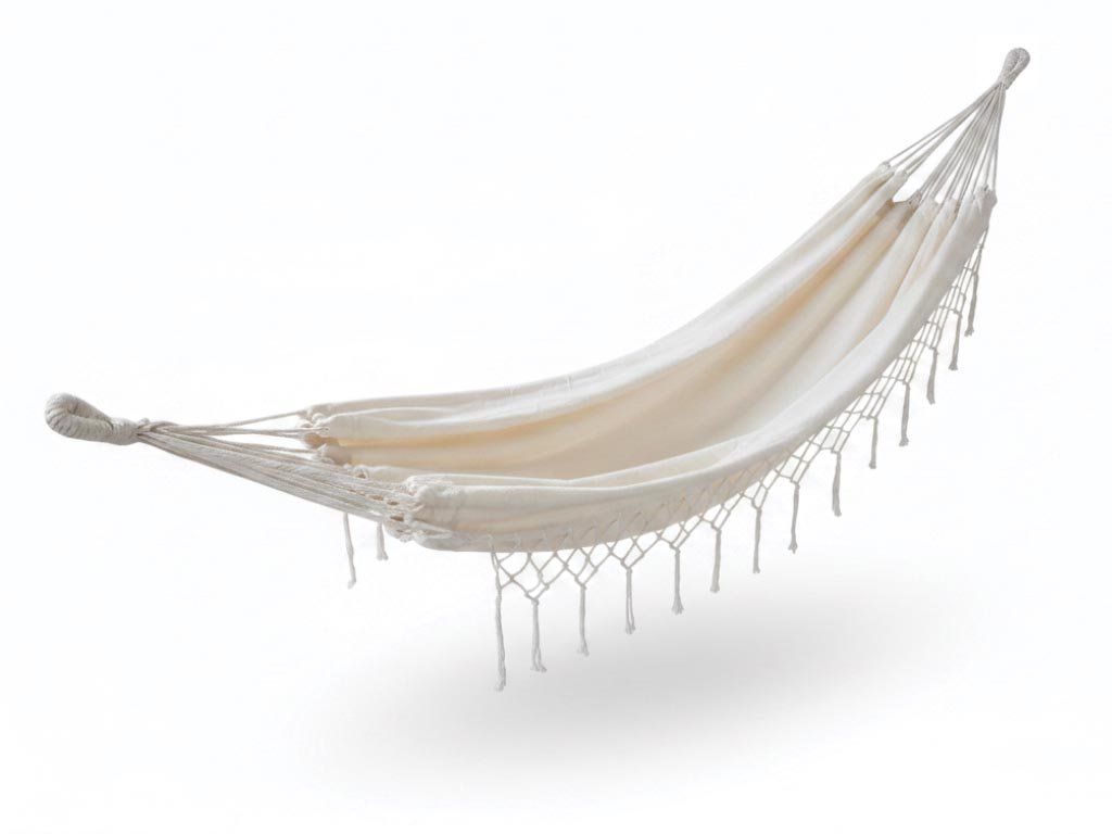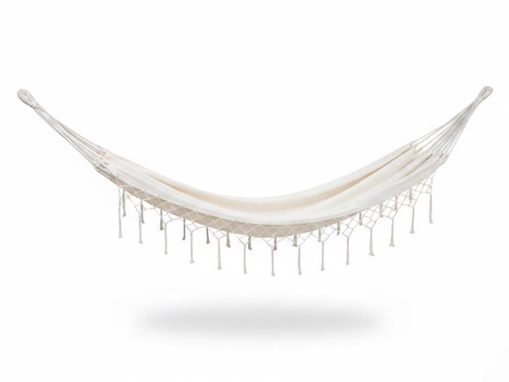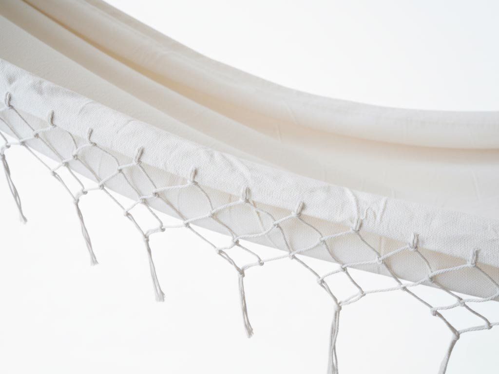 Textilní houpací síť může mít stopy a nepravidelnosti typické pro ruční výrobu. Doporučujeme prát ručně, nepoužívejte pračku ani sušičku.