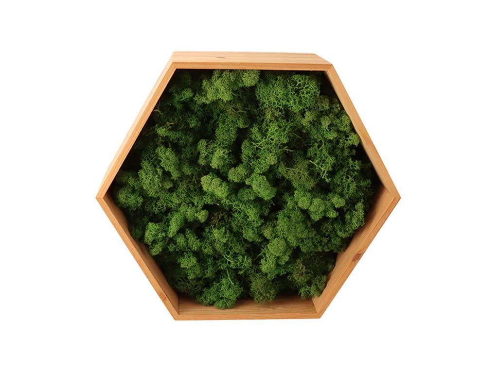 Přírodní dekorace s nádechem severského minimalismu - to je náš mechový hexagon. Kombinuje dřevěný rám ve tvaru šestihranu s kvalitním stabilizovaným mechem, který nevyžaduje žádnou údržbu a přitom vypadá stále svěže.
