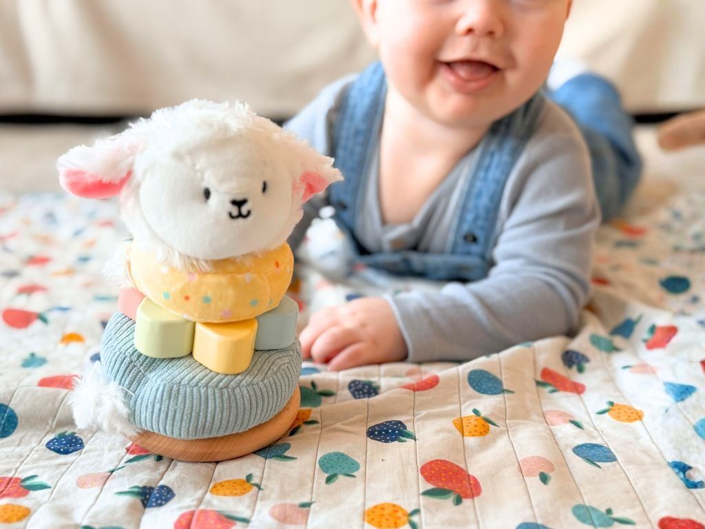 Dřevěná hračka kombinuje barevné kroužky různých velikostí, materiálů a textur, které děti postupně navlékají na tyčku tvořící tělo ovečky. Hra začíná látkovým kroužkem s ocáskem a končí plyšovou hlavičkou ovečky - ideální pro rozvoj jemné motoriky a koordinace rukou a očí.