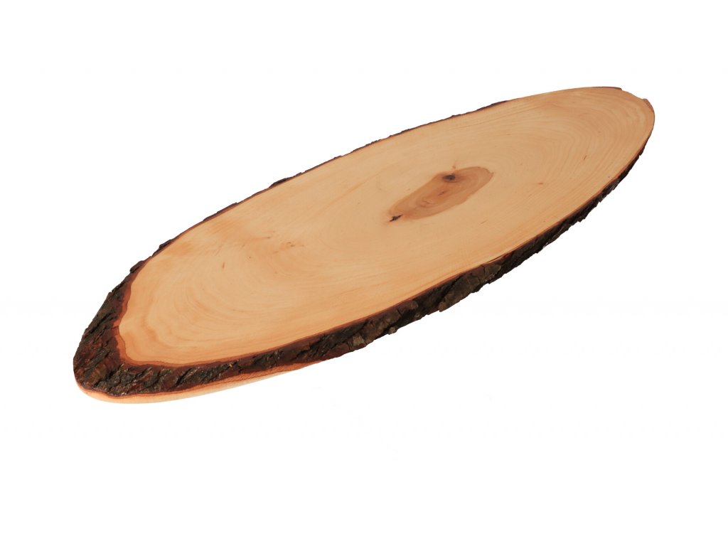 Stylové prkénko na krájení nebo servírování předkrmů vyrobené z olšového dřeva. Má oválný tvar a okraje jsou pokryty přírodní kůrou.