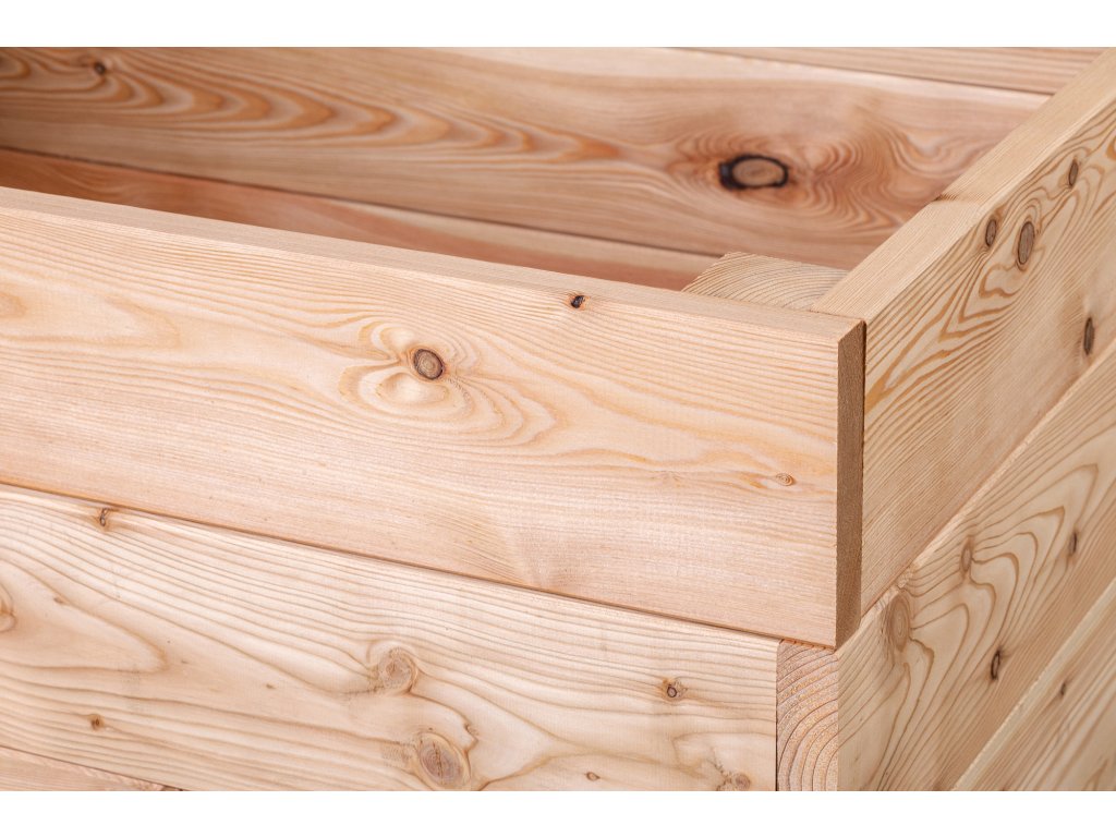Modřínové dřevo je ideální materiál pro venkovní vyvýšené záhony. Vyniká dlouhou životností a nízkými nároky na údržbu. Tento typ dřeva je také velmi odolný vůči změnám teploty, vlhkosti a dalším povětrnostním vlivům.