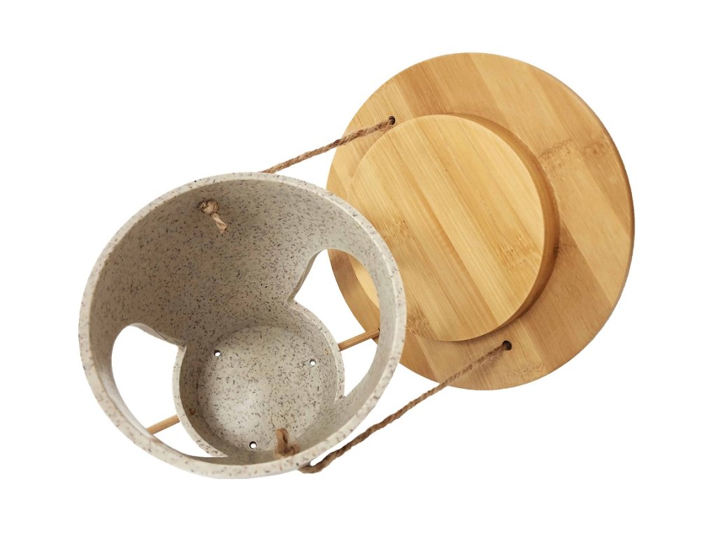 Krmítko je vyrobeno z recyklovaných rostlinných vláken a má bambusové víko. Díky provazu lze krmítko snadno zavěsit na pevnější větev nebo kamkoli vás napadne. Ze spodu jsou vyvrtané 3 otvory, které slouží k odtoku vody.