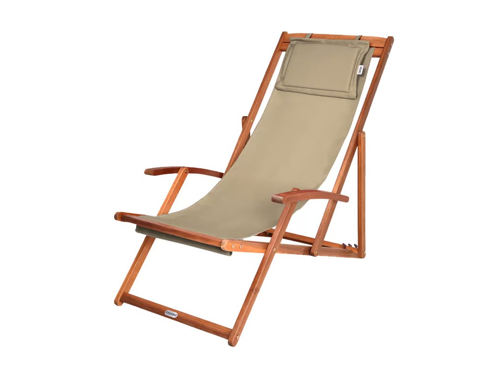 Lehátko je nastavitelné ve 3 polohách a snadno skládací, takže se jednoduše přenáší i skladuje. Komfort zajišťují područky a odnímatelný polstrovaný hlavový polštář se suchým zipem. Prodyšná textilie se přizpůsobí tělu a zabraňuje pocení i při delším sezení.